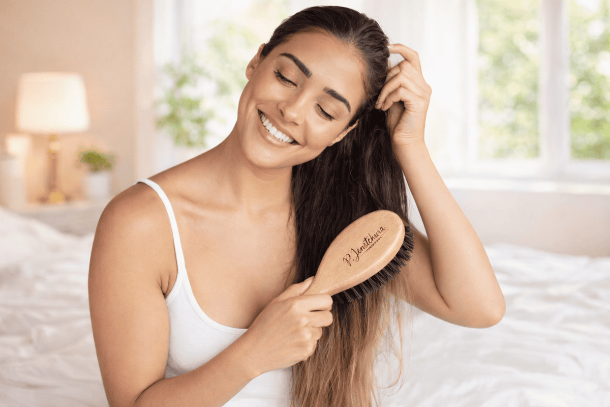 Die hochwertigen Wildschweinborsten aus dem ersten Schnitt regen die Durchblutung der Kopfhaut an und fördern damit die Reinigung und Regeneration des Haarbodens, der reich an Schweiß- und Talgdrüsen ist. Gleichzeitig wird der körpereigene Talg besonders schonend vom Haaransatz bis in die Spitzen verteilt – eine der natürlichsten Möglichkeiten, das Haar zu pflegen, vor Trockenheit zu schützen und ihm einen gesunden Glanz zu verleihen.