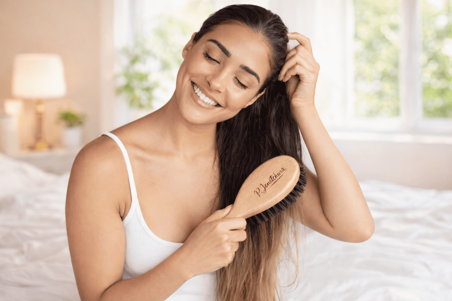 Die Jentschura Profi Haarbürste greift ein bewährtes Pflegeritual auf, das seit Generationen für gesunde Haare und eine vitale Kopfhaut geschätzt wird: das tägliche Bürsten. Nach dem Prinzip der „hundert Bürstenstriche am Tag“ unterstützt sie eine sanfte, ursprüngliche Haarpflege und begleitet dich bei einer natürlichen Pflegeroutine für Kopfhaut und Haar.