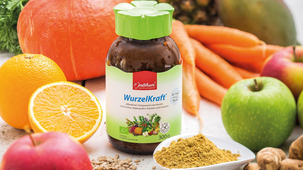 Das 100-Pflanzen-Feingranulat WurzelKraft liefert eine Vielzahl an Vitaminen, Mineralstoffen und sekundären Pflanzenstoffen, die Haargesundheit und des Haarwachstums unterstützen.
